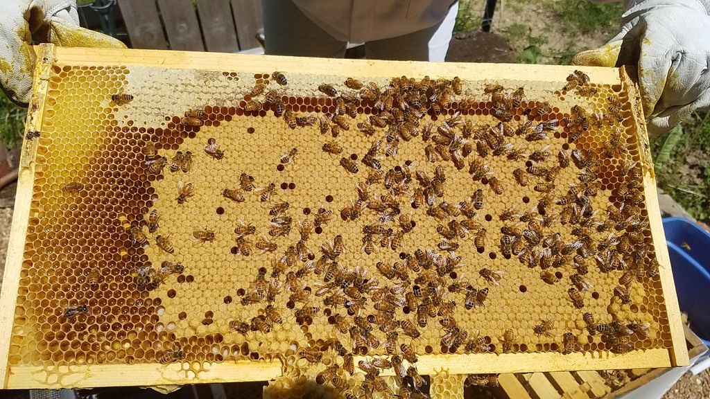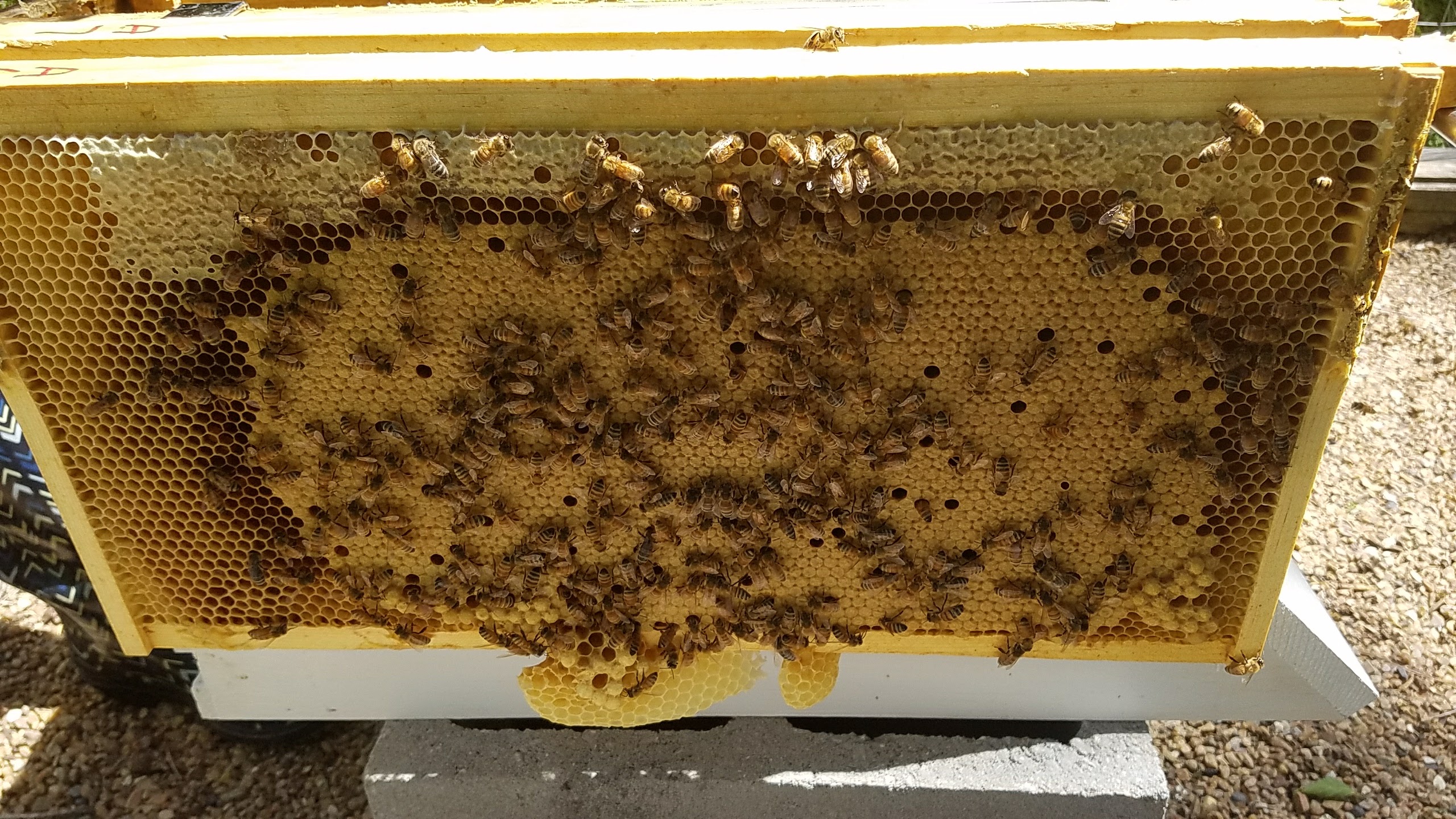 After 3 weeks both new packages are looking good. We didn’t see the queen during either inspection, but there is lots of brood and larvae. The first two photos below show a nearly perfect frame. Honey stored along the top, solid worker brood in the middle surrounded by pollen, and drone brood on the bottom right. You can also see larvae on the bottom left waiting to be capped.