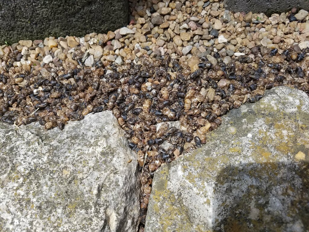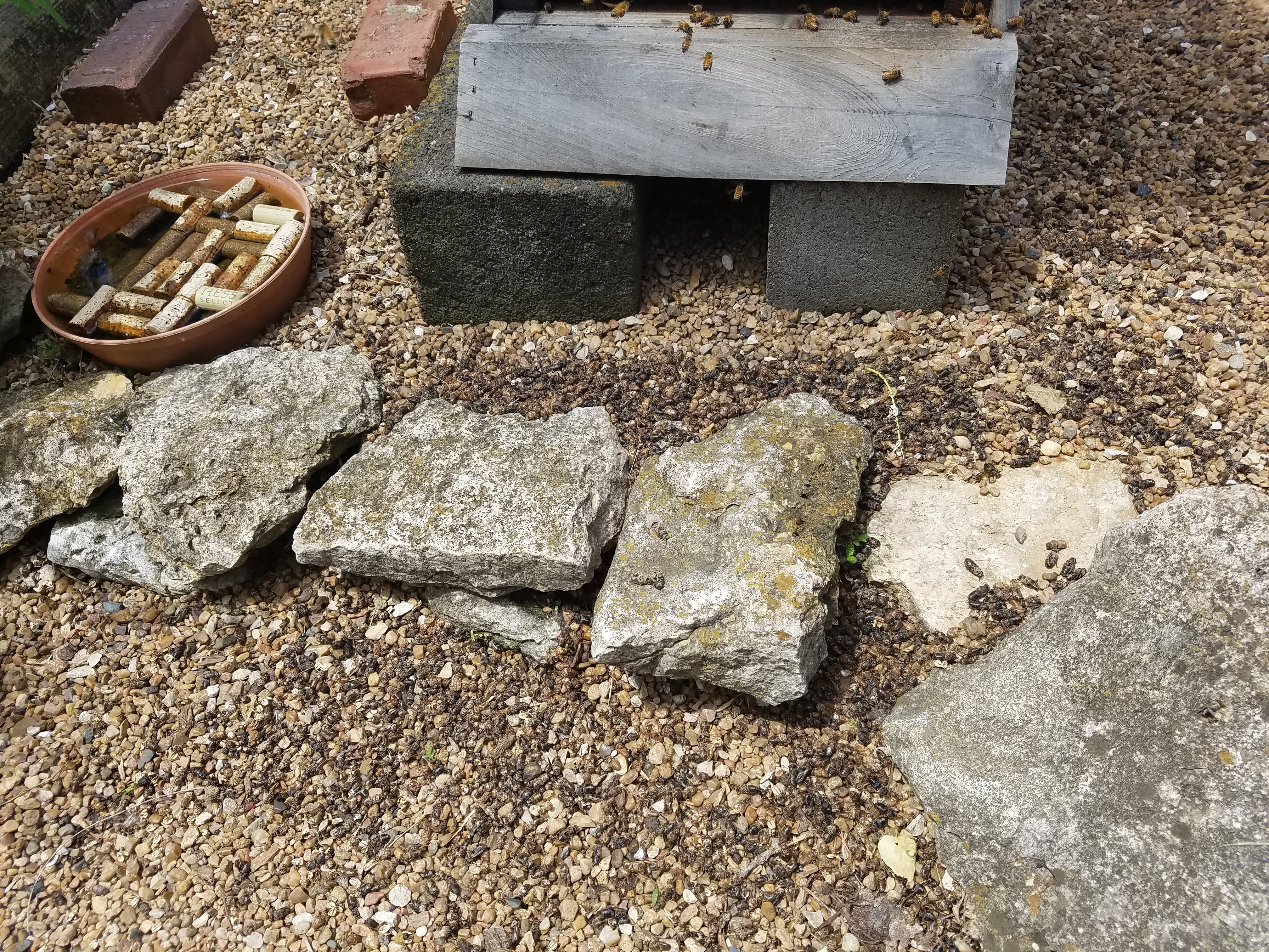 The rainy weather forecasted for the week has mostly been at night, with partly cloudy and sunny days. I know I said previously that I wouldn’t be touching the hives for a couple of weeks but plans do change. I initially went out just to heft the Roman honey super to get a feel for how it was filling up. To my amazment there were hundreds of dead bees in front of the hive and they were stinking.