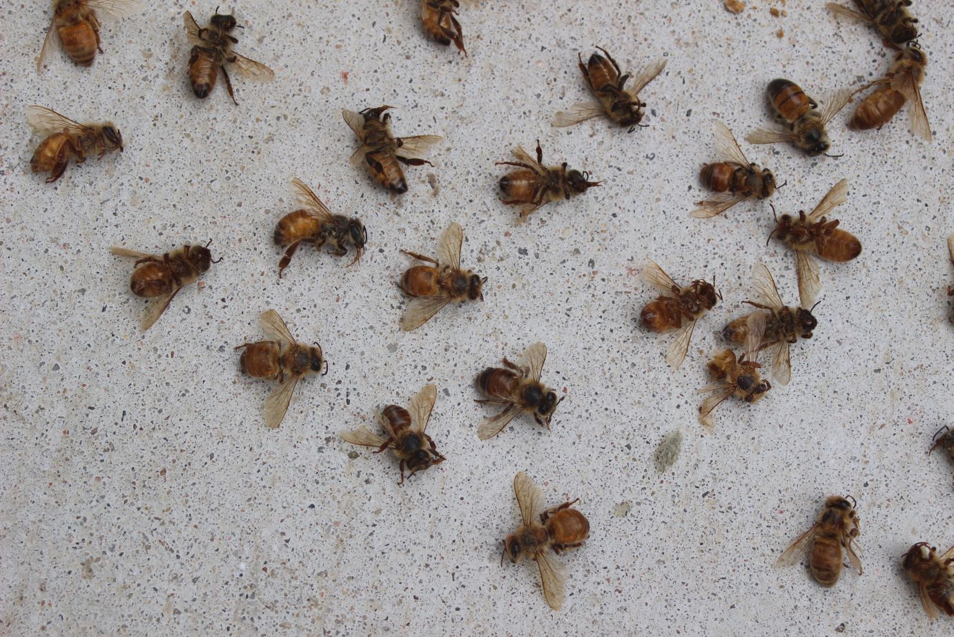 After a couple of hours I removed the package and dumped the dead bees out on the sidewalk. Most looked healthy, some were smaller and had some wing damage.