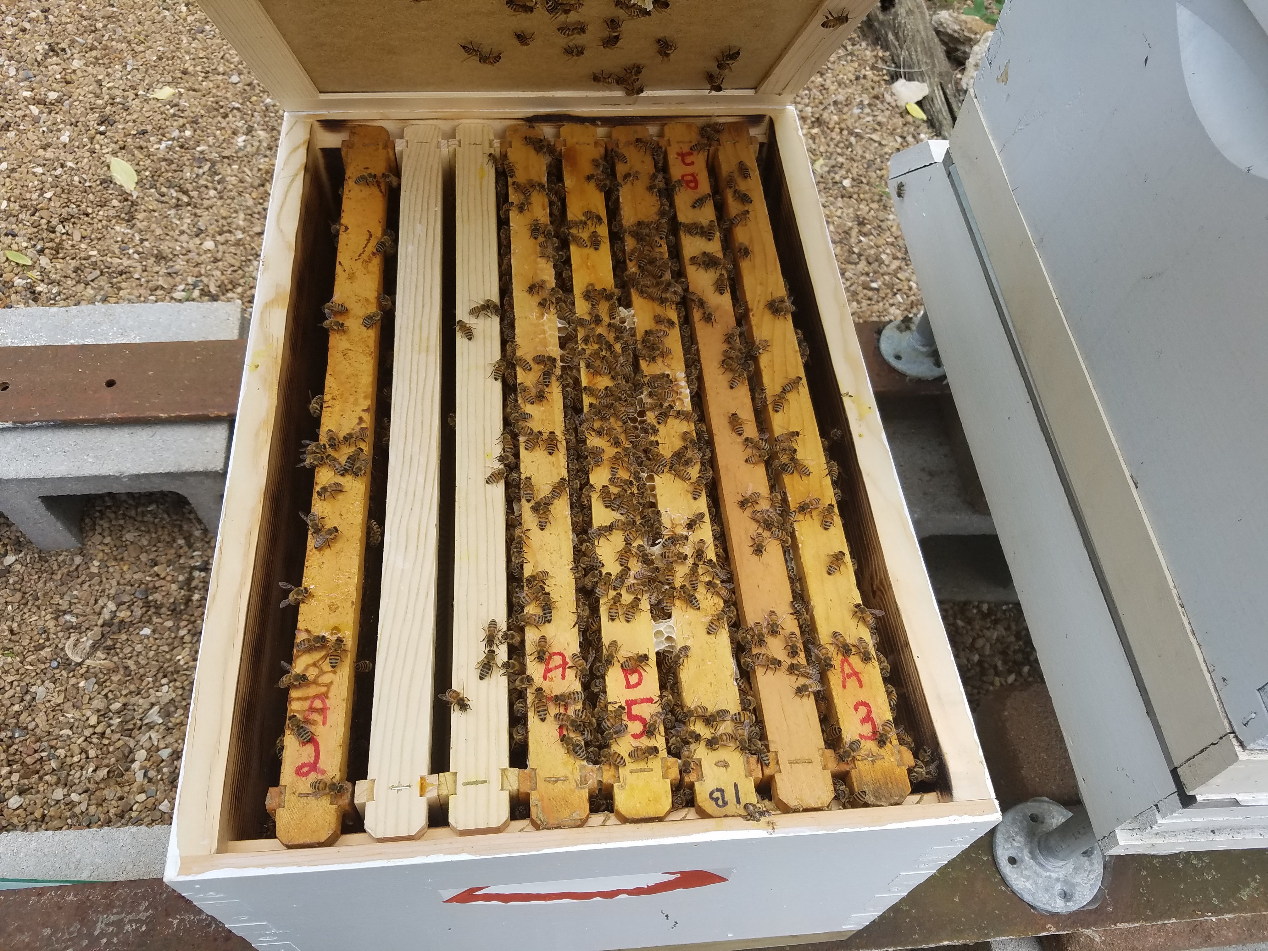 I checked on the newest swarm hive this morning and they look happy and are setting up house. I removed the branch and added 2 more frames to fill out the hive. I also noticed they are building new comb around the frame of brood I added 2 days ago.