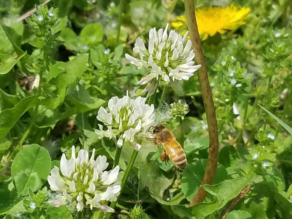 Tomorrow I plan to swap out the bottom board and add a screened bottom board and a slatted rack. I just painted them yesterday and want them to cure for another day. I may go ahead and remove the feeder since there is plenty of clover blooming, and one of the frames I gave them today is half full of honey. That will kind of depend on the weather.